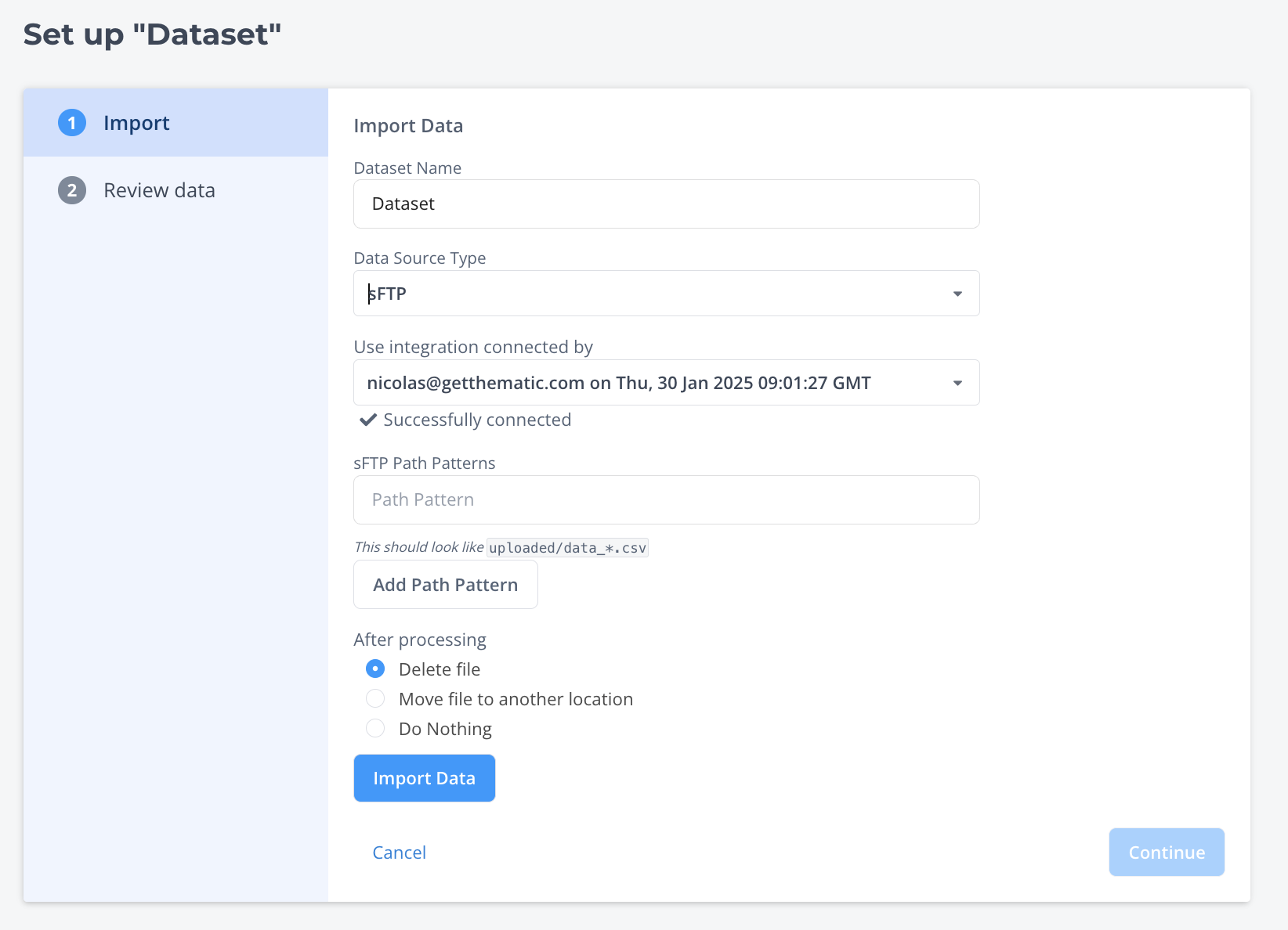 An sFTP connection allows data to be uploaded to Thematic directly for processing from our own sFTP server. If you'd like to use Thematic's sFTP server contact your CSM.