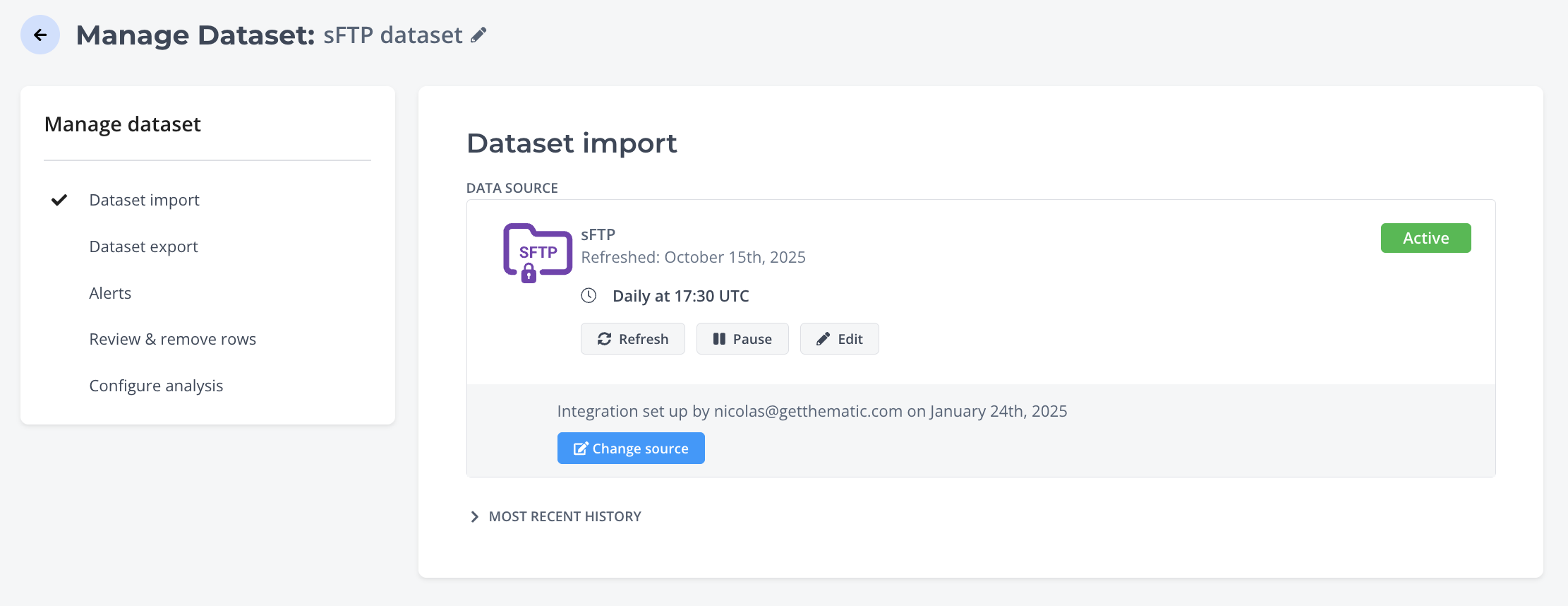 Make sure your sFTP server is ready, and you have a Thematic account with data managing permissions. Connect the sFTP server in the manage integrations page.