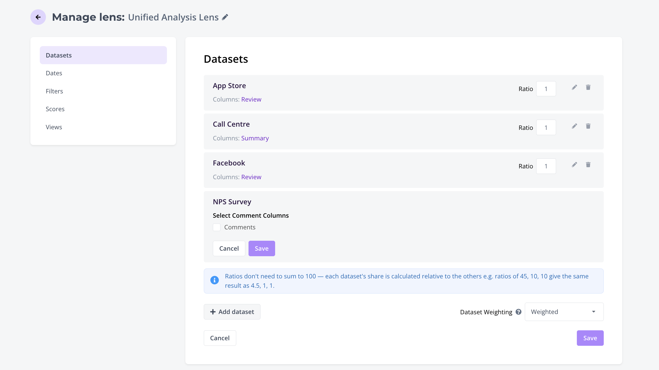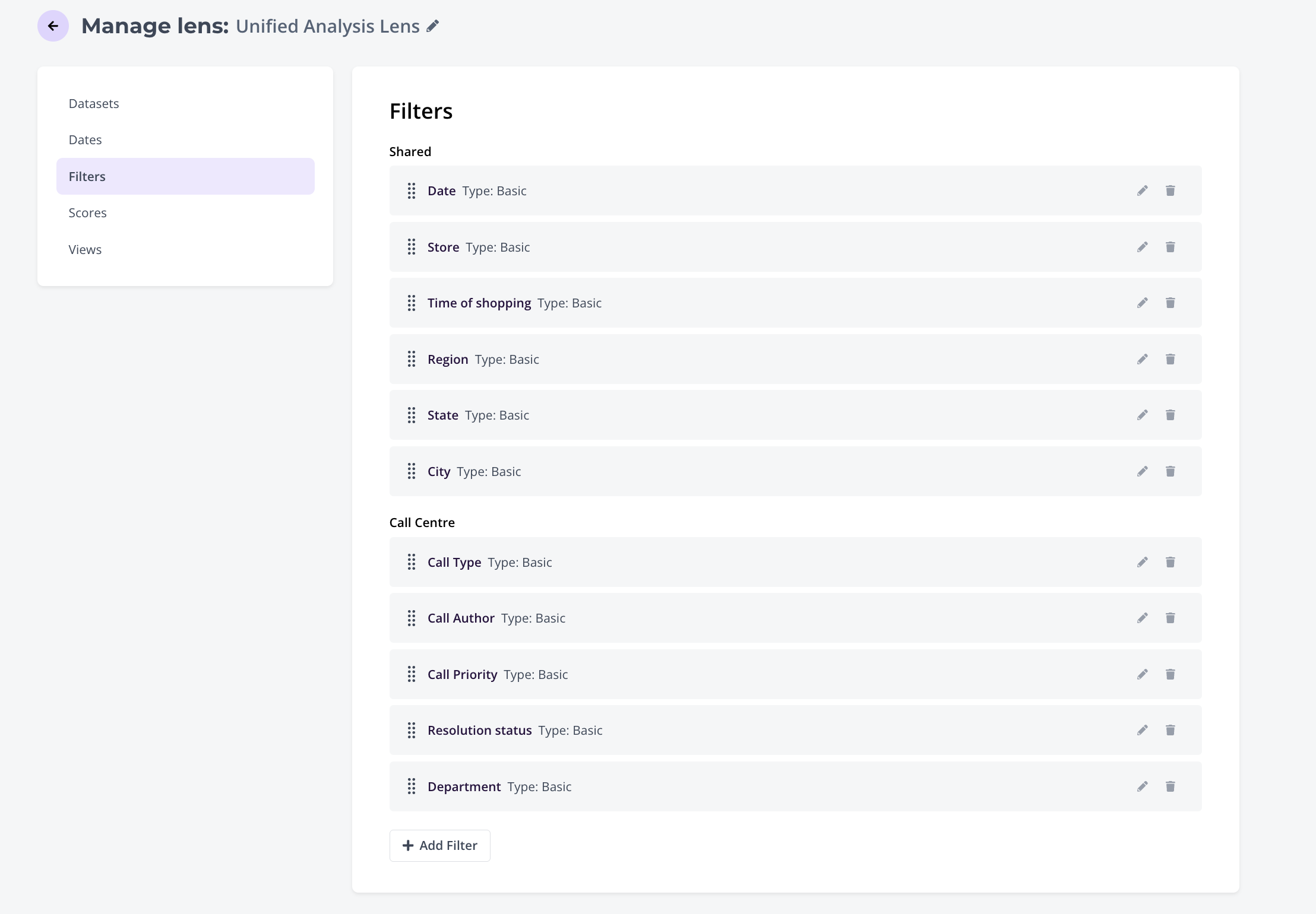 You can view all the filters you've created, sorted into shared (Multiple datasets have data for a filter) to individual (A filter only applies to one dataset) You can re-order, edit and delete any of your filters