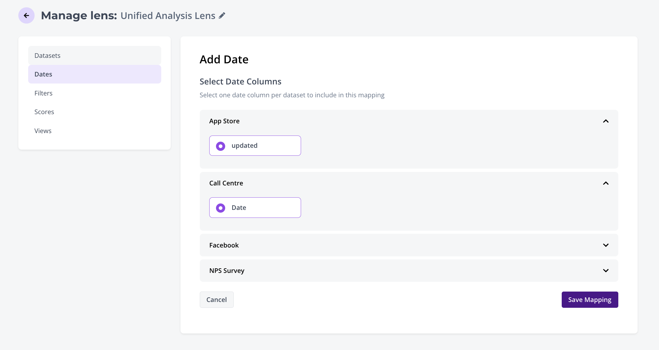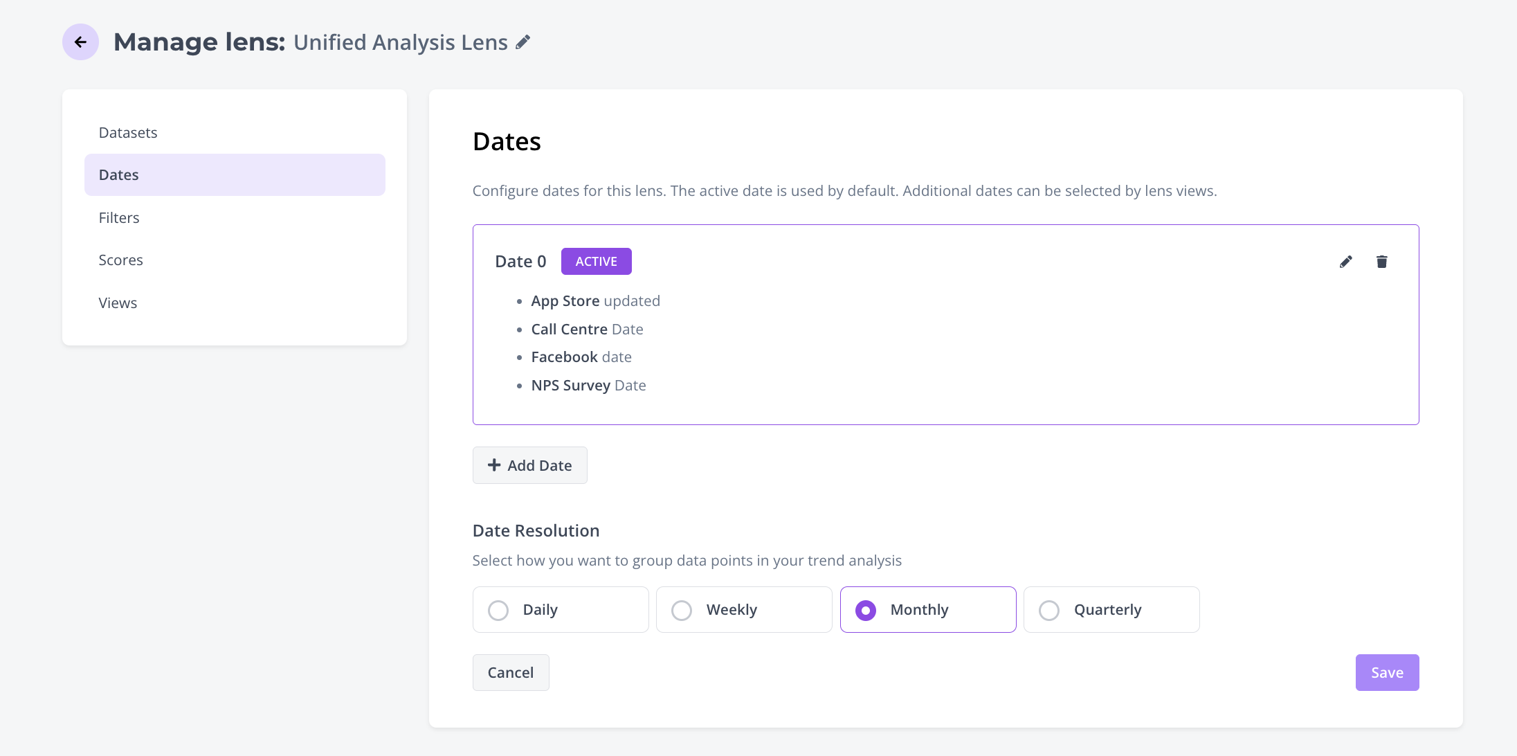 This allows your lens to use a single date for each dataset to be used for trending/score change in the analysis tools. You can also choose a default date resolution to be shown that's most relevant for your data (Can be changed in the analysis tools as needed)