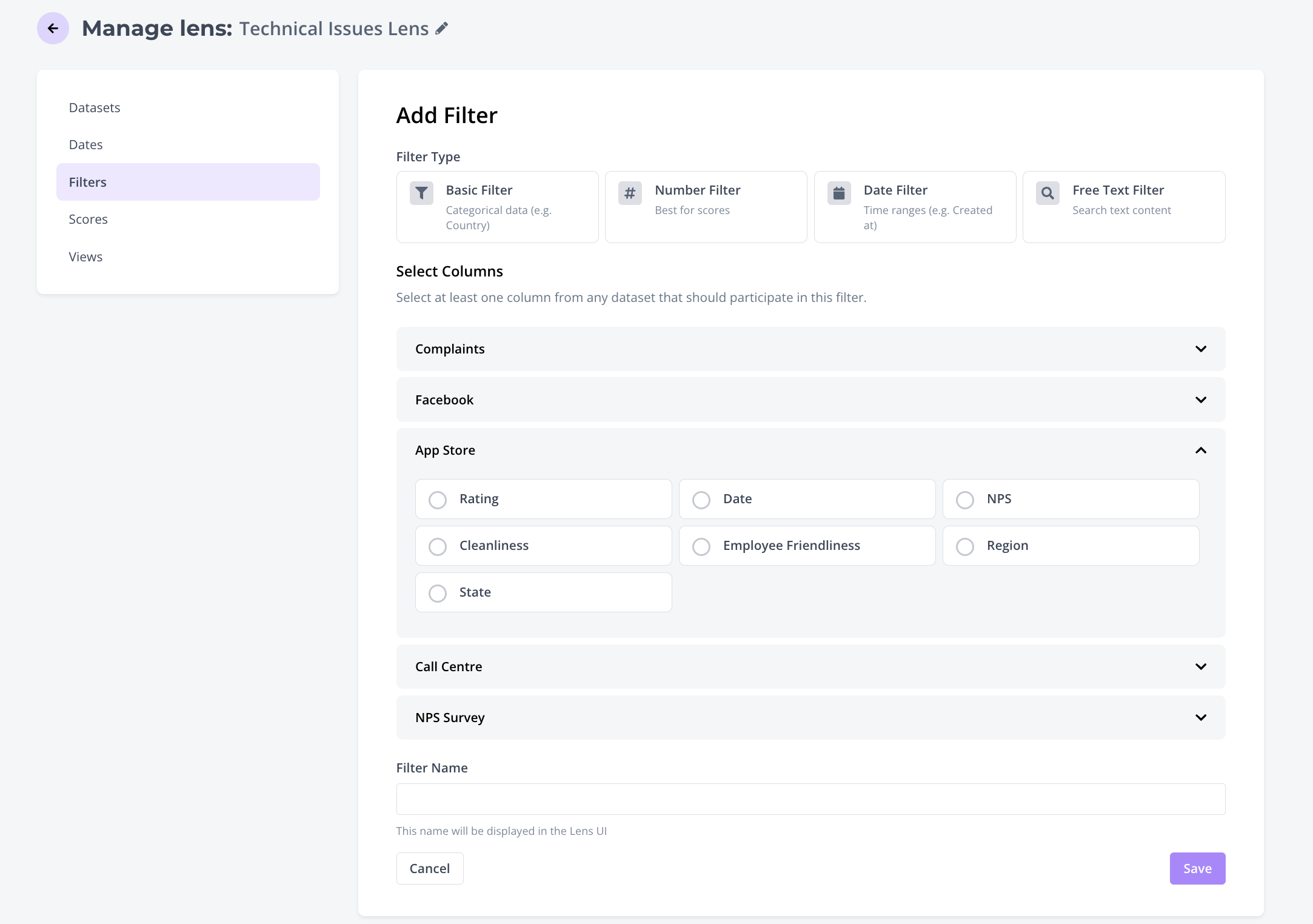 Then you can select the column from each dataset that should be used when applying this filter. A filter could apply across all the lenses datasets, or just one. Filter names are how it appears everywhere in the portal